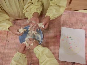 「猫の手だね」「お家でやったことある!」等会話も楽しみながら職員と一緒に行いました。