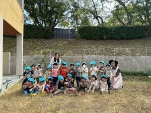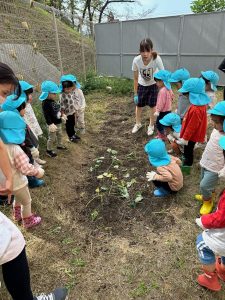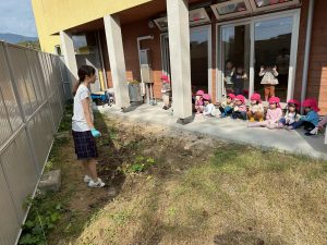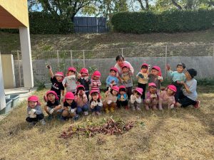 10月24日(火)に園舎の裏の畑で2歳児と3歳児が芋掘りごっこをしました。