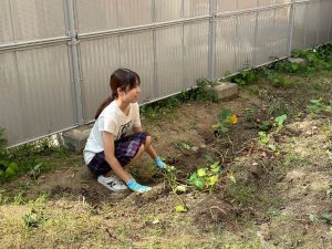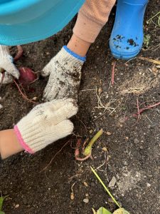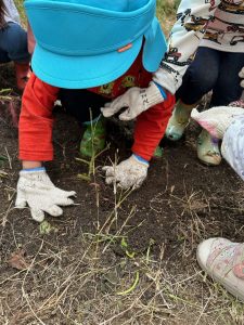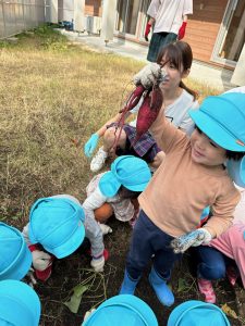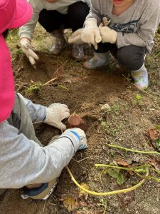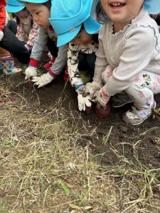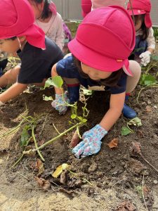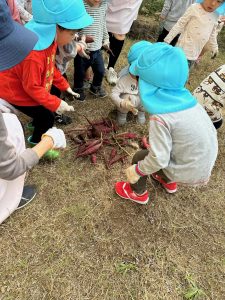 土を掘ってお芋を探しました。軍手もしていて難しい!みんなで協力して最後まで掘りました。