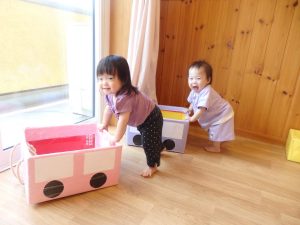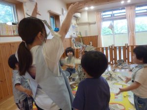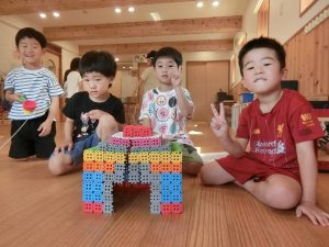 室内では、遊びの中でみんなで一つの作品を作る姿も見られます。