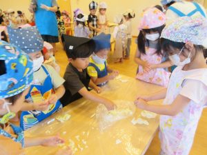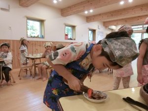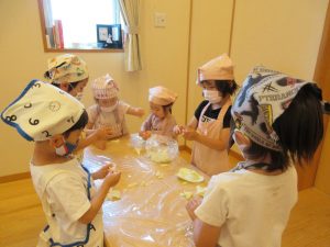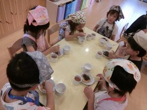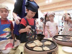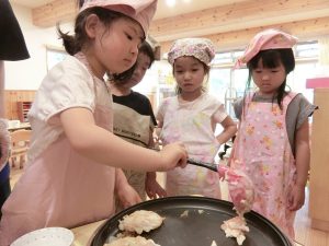 年長児は、ちぎったり皮をむいた野菜を使い、おやつの時間にお好み焼きを作って食べました。