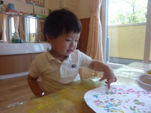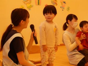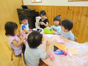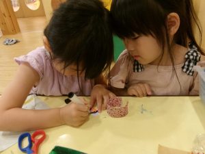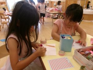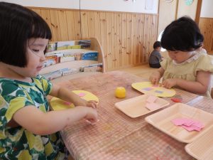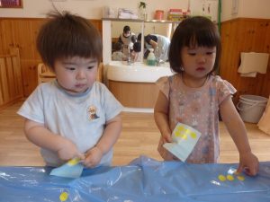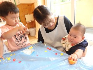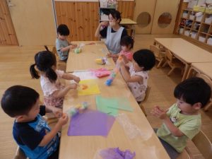 1歳児クラスのお友だちと一緒に七夕製作を楽しみました。
