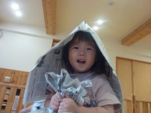 新聞紙遊びでは、ちぎった新聞紙を上から降らせると大喜びの子どもたちです。