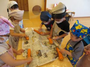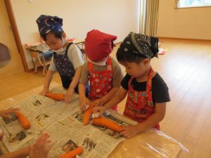 にんじんの皮むきは、丸めたアルミホイルでにんじんを擦っておこないました。地道な作業でしたが、