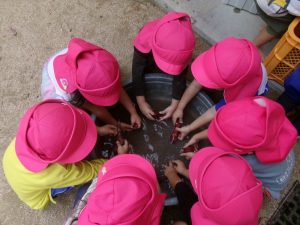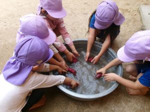 年少児は園の畑で、年中・年長児は広島市青少年活動センターの畑で芋掘りをしました。