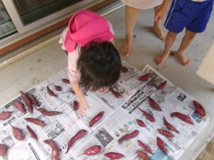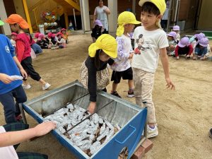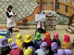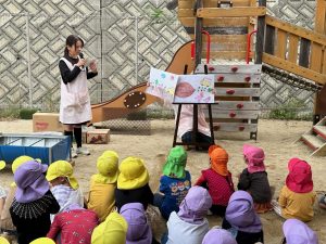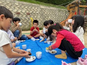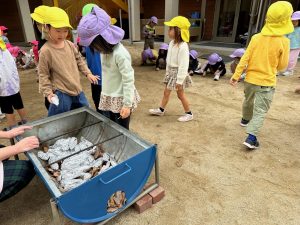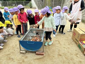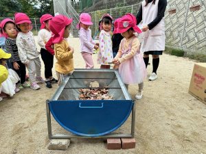 お昼寝から目覚めると子どもたちは、「いいにおいがする」「お芋のにおいがする」と言いながら、園庭に集まりました。