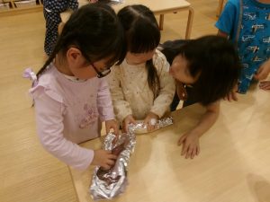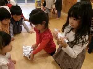 乾いたお芋をアルミホイルで巻いて、焼き芋会まで楽しみに待っていました。