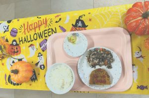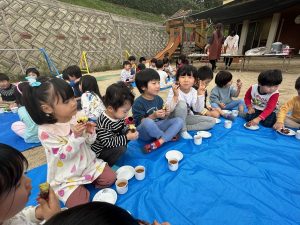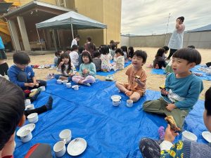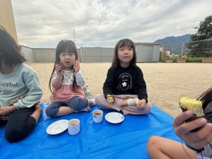 青空の下、「おいしいい」「おかわり」とおいしくお芋をいただきました。
