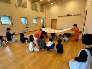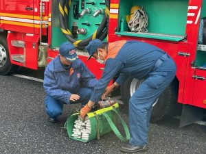 長いホースをみんなで持ち上げ「重い」「長い」等感想を伝えていました。