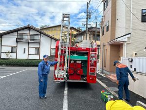 今日見せてもらった消防車は家庭のお風呂9杯分の水を積んでいるようです。