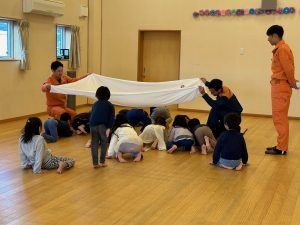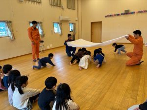 布を煙に見立て、煙の下をとおる避難の仕方を学びました。