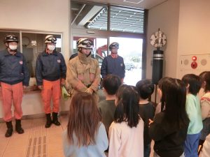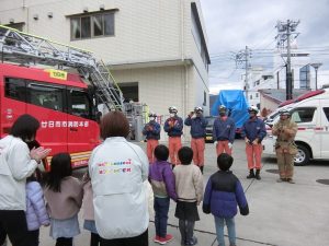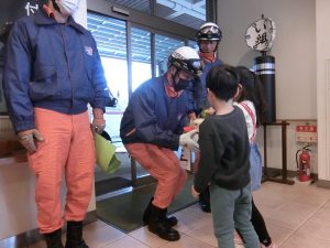 消防署に到着し消防車の前で挨拶をして渡しました。