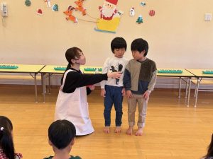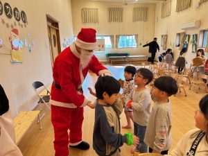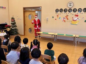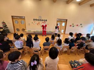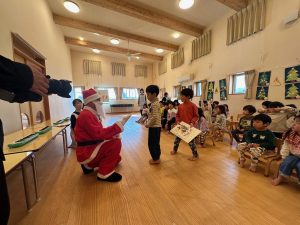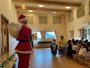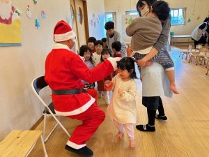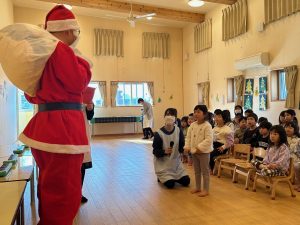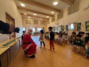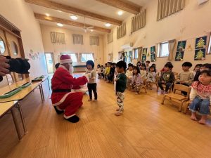 幼児組も職員からのシアターを観た後、鈴の音と共に登場したサンタクロースにとても喜ぶ姿が