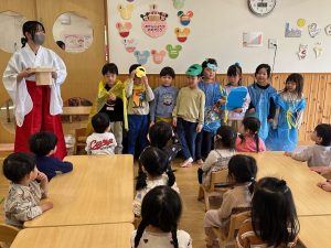 年長児が豆まきについて各クラスに由来や豆まきについて話しをしてまわってくれました。
