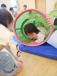 遊戯室ではトンネルやマットを使い身体を動かします。