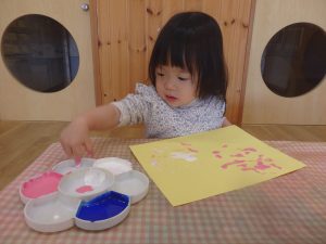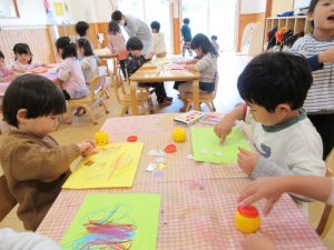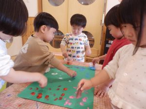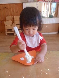 きのこの製作では、お絵描きをしたり絵の具スタンプをしたりしました。