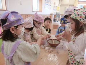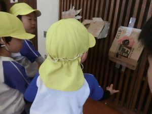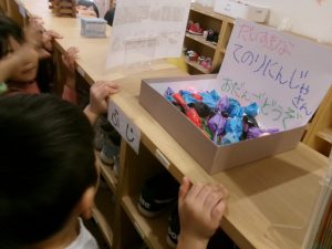 子どもたちが大好きな絵本の『てのりにんじゃ』。「にんじゃに会いたい!」と園内にお団子を準備してみると、