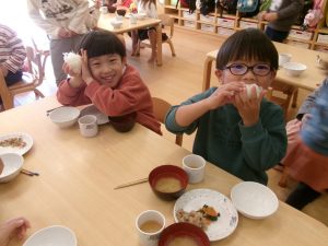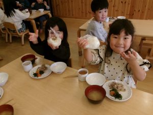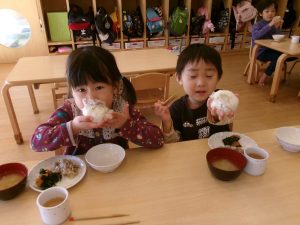 給食時にラップを使っておにぎりを作り、完成したふりかけをかけて美味しくいただきました。