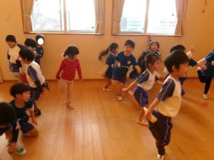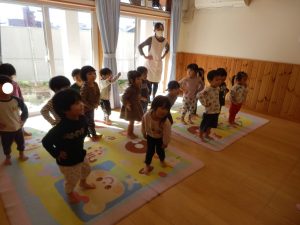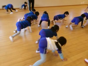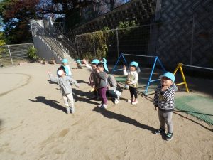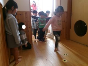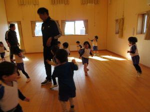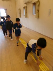 園内に小さなにんじゃが遊びに来てくれました。みんなで忍び足の術に挑戦してみたりもしました。