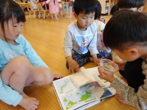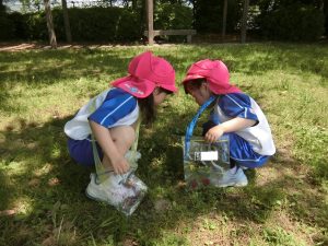 園庭で見つけた虫の名前を図鑑で調べていました。今回は育てずに園庭に返してあげていました。