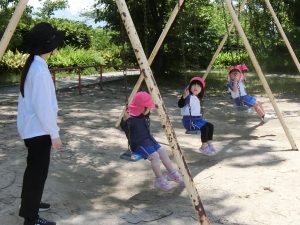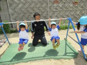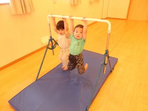しっかり鉄棒にぶら下がりゆらゆら。手の力が強くなりますね!