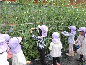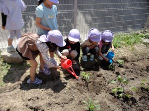 年長児が園庭の畑に夏野菜の苗を植えました。