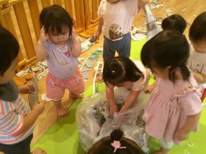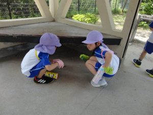 「これは燃える?」「燃えない?」とお友だちと確認しながら拾い分別していました。