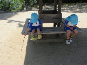 ベンチでは良い枝を見つけてきた子どもたちが魚釣りを始めました。