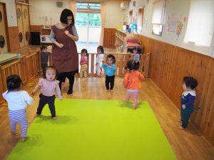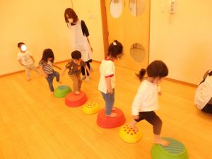 身体遊びをしていると、ウェーブバランスをバスに見立てた遊びが始まりました。バスにのっての歌に合わせて出発です!