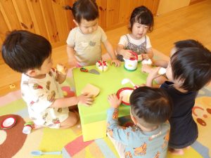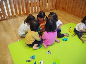 子どもたちが好きな磁石のブロックです。お友だちと1つのものを作る姿が見られるようになってきました。