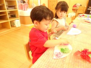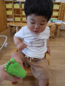 製作に使う足型をとりました。絵の具を塗る時に少しくすぐったそうにしていました。