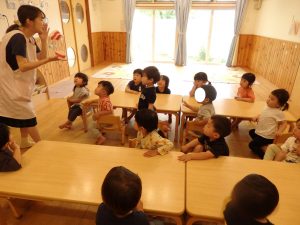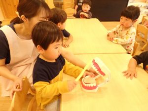 絵本を見て、歯磨きの大切さを確認しました。歯の模型で歯磨きの練習もしてみました。