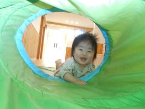室内ではトンネルくぐりに挑戦です。にこにこ笑顔が可愛いですね。
