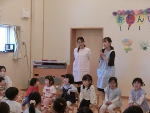 絵本を見て、歯磨きの大切さを確認しました。歯の模型で歯磨きの練習もしてみました。