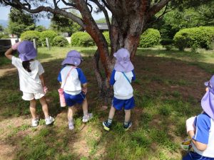 園庭で見つけた虫の名前を図鑑で調べていました。今回は育てずに園庭に返してあげていました。