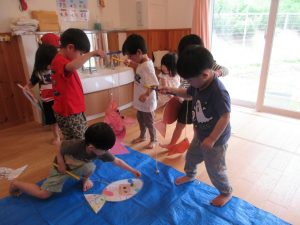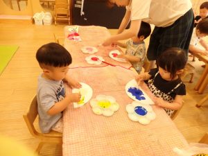製作に使う足型をとりました。絵の具を塗る時に少しくすぐったそうにしていました。