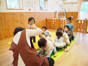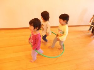 身体遊びをしていると、ウェーブバランスをバスに見立てた遊びが始まりました。バスにのっての歌に合わせて出発です!