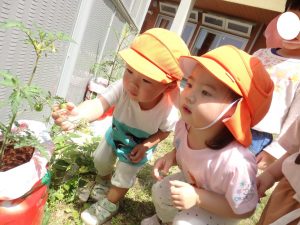 園庭にできたトマトを発見しました!優しく触って観察していました。
