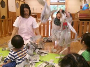新聞紙遊びが大好きで、上に投げると大盛り上がりの様子です。