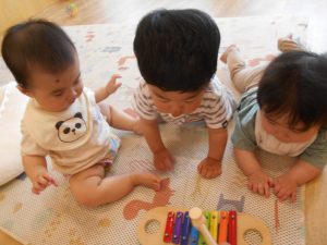 子どもたちが好きな磁石のブロックです。お友だちと1つのものを作る姿が見られるようになってきました。