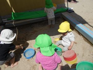 他クラスのお友だちと一緒にお砂場遊びをしました。スコップをしっかり持って砂をすくっていました。